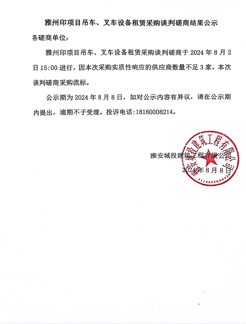 雅州印項目吊車、叉車設備租賃采購談判磋商結果公示