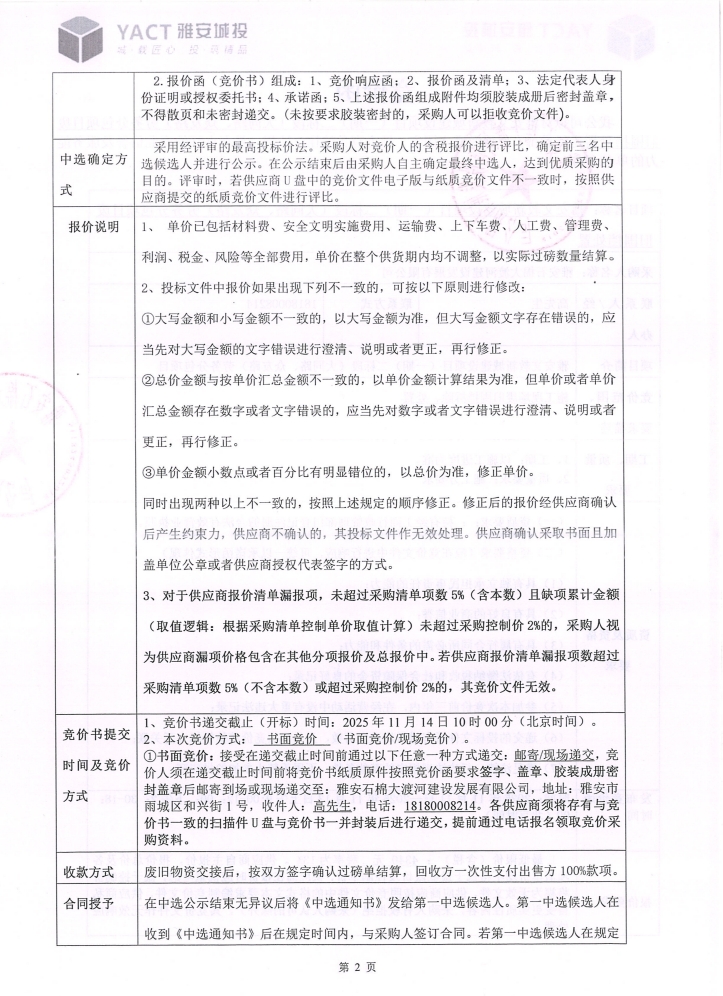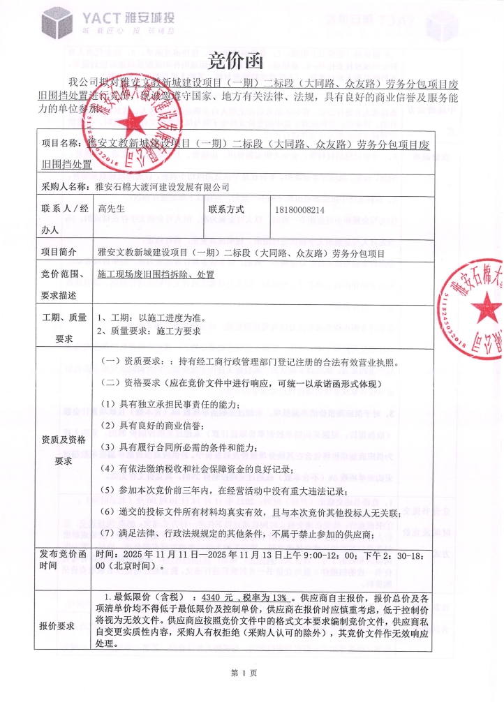 雅安文教新城建設(shè)項(xiàng)目(一期)二標(biāo)段(大同路、眾友路)勞務(wù)分包項(xiàng)目廢舊圍擋處置競價(jià)公告