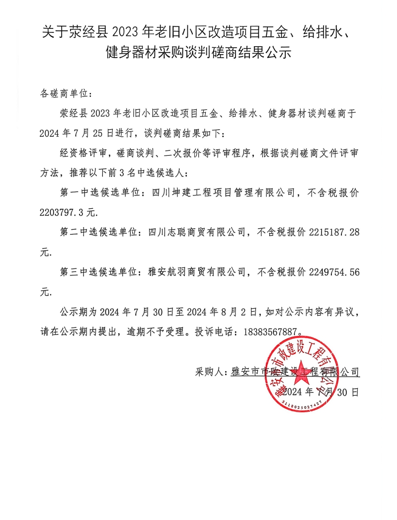 關于滎經縣2023年老舊小區(qū)改造項目五金、給排水、健身器材采購談判磋商結果公示