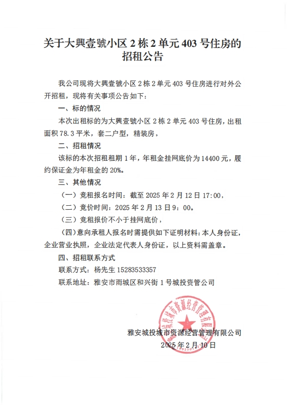關(guān)于大興壹號小區(qū)2棟2單元403號住房的招租公告