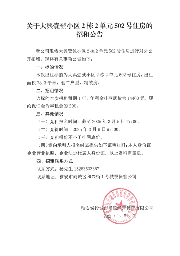 關(guān)于大興壹號(hào)小區(qū)2棟2單元502號(hào)住房的招租公告