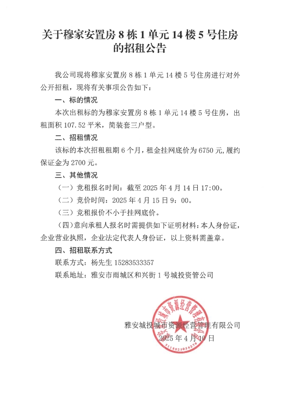 關(guān)于穆家安置房8棟1單元14樓5號住房的招租公告