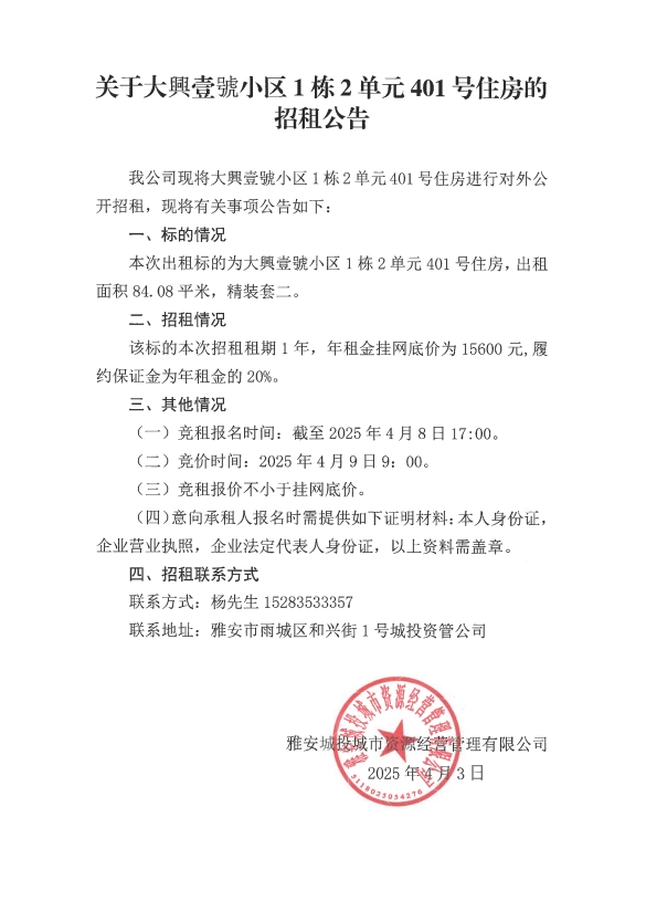 關(guān)于大興壹號小區(qū)1棟2單元401號住房的招租公告
