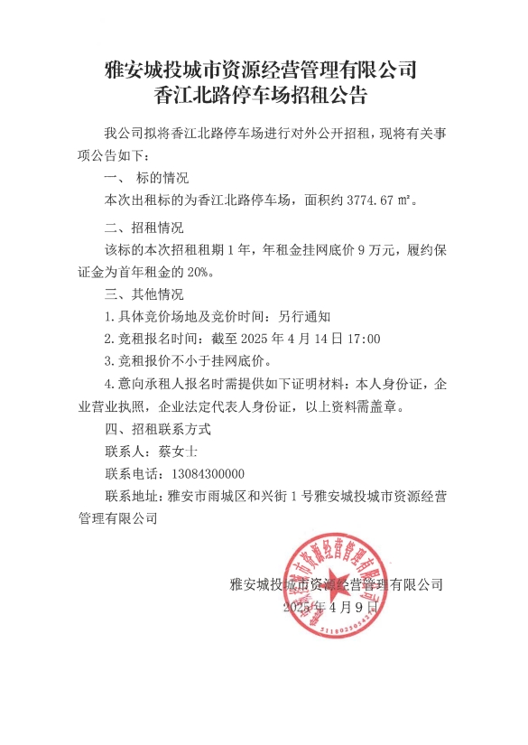 雅安城投城市資源經(jīng)營管理有限公司香江北路停車場招租公告