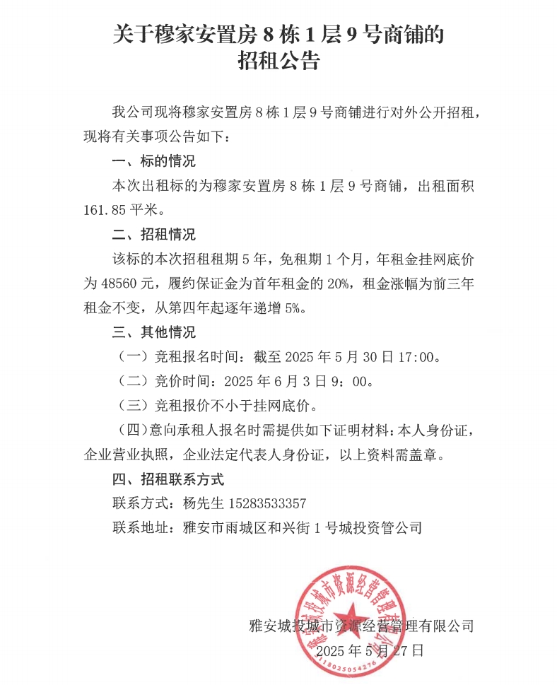 關(guān)于穆家安置房8棟1層9號商鋪的招租公告
