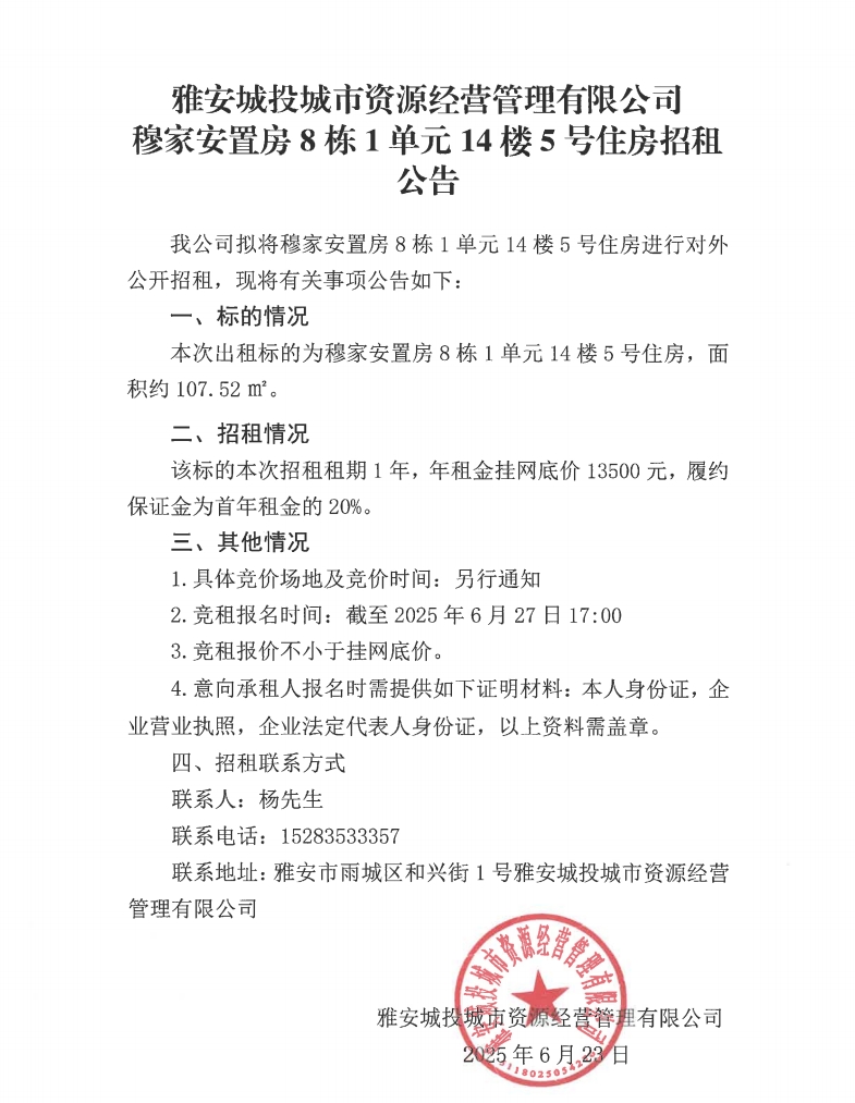 雅安城投城市資源經(jīng)營管理有限公司穆家安置房8棟1單元14樓5號住房招租公告