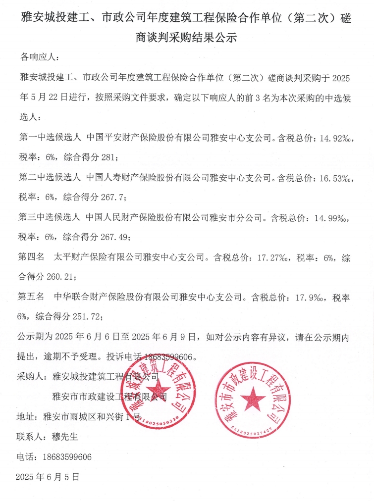 雅安城投建工、市政公司年度建筑工程保險合作單位(第二次)磋商談判采購結(jié)果公示