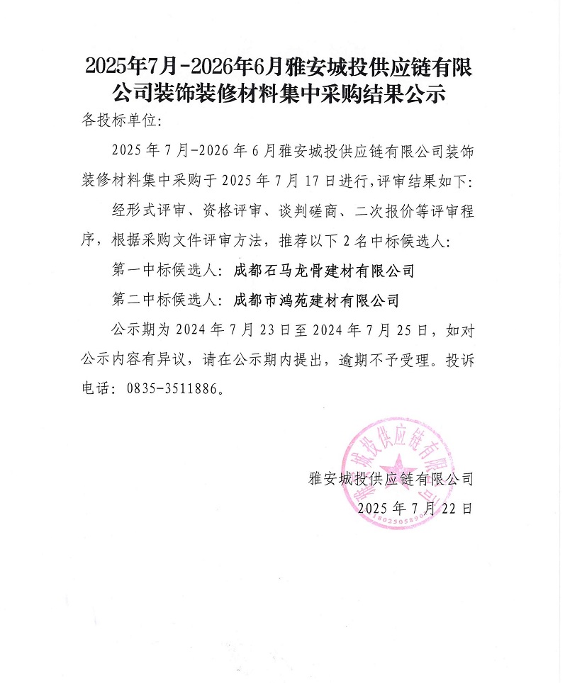 2505年7月-2026年6月雅安城投供應(yīng)鏈有限公司裝飾裝修材料集中采購結(jié)果公示