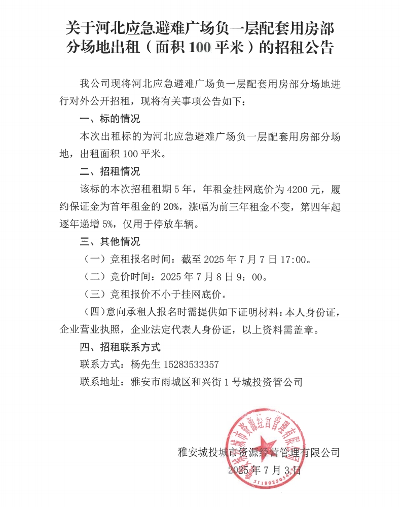 關于河北應急避難廣場負一層配套用房部分場地出租(面積100平米)的招租公告