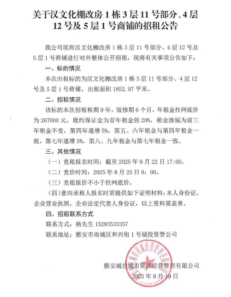 關(guān)于漢文化棚改房1棟3層11號部分、4層12號及5層1號商鋪的招租公告