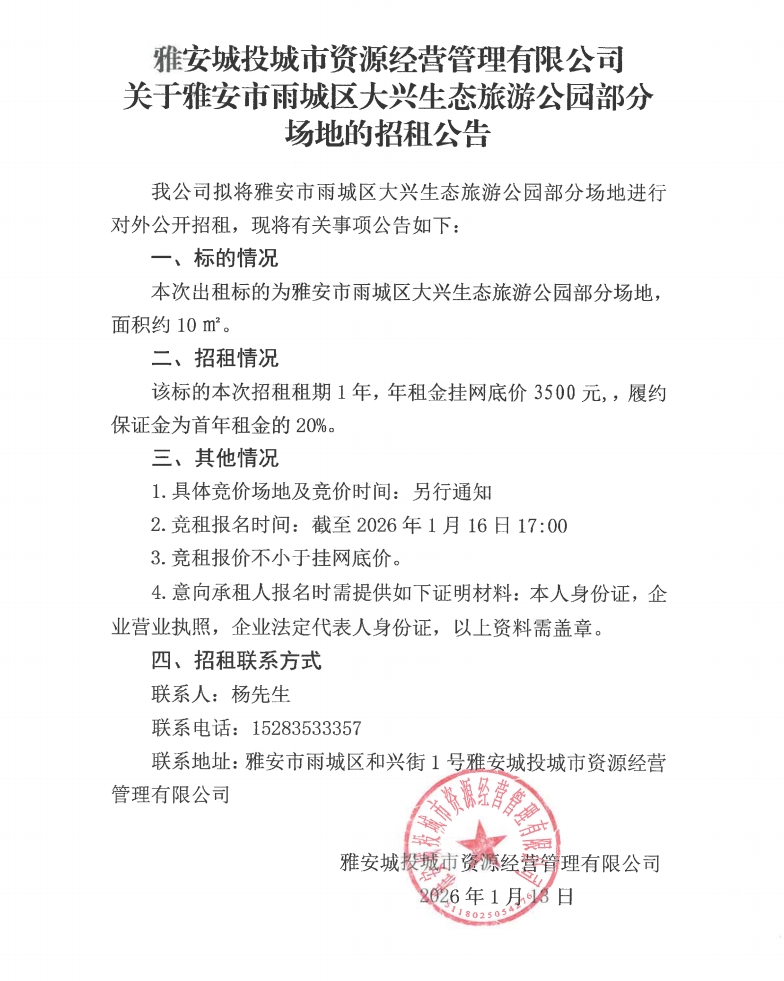 雅安城投城市資源經營管理有限公司關于雅安市雨城區(qū)大興生態(tài)旅游公園部分場地的招租公告