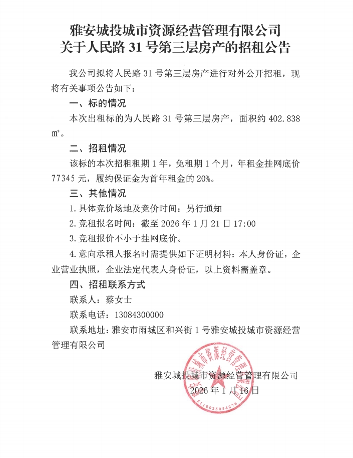 雅安城投城市資源經營管理有限公司關于人民路31號第三層房產的招租公告