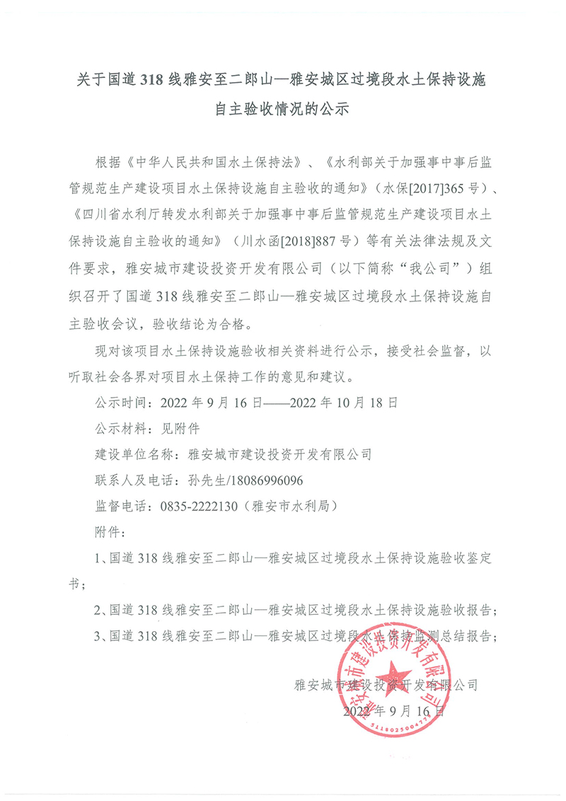 關(guān)于國(guó)道318線雅安至二郎山—雅安城區(qū)過(guò)境段水土保持設(shè)施自主驗(yàn)收情況的公示