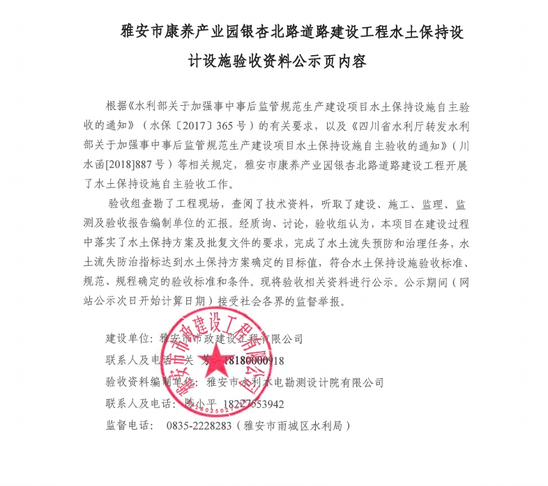 雅安市康養(yǎng)產業(yè)園銀杏北路道路建設工程水土保持設計設施驗收資料公示頁內容