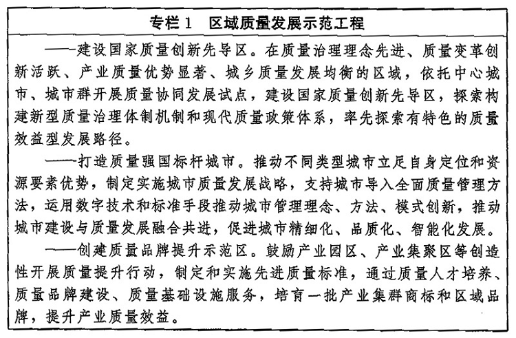 (九)打造區(qū)域質(zhì)量發(fā)展新優(yōu)勢。加強(qiáng)質(zhì)量政策引導(dǎo),推動(dòng)區(qū)域質(zhì)量發(fā)展與生產(chǎn)力布局、區(qū)位優(yōu)勢、環(huán)境承載能力及社會(huì)發(fā)展需求對(duì)接融合。推動(dòng)?xùn)|部地區(qū)發(fā)揮質(zhì)量變革創(chuàng)新的引領(lǐng)帶動(dòng)作用,增強(qiáng)質(zhì)量競爭新優(yōu)勢,實(shí)現(xiàn)整體質(zhì)量提升。引導(dǎo)中西部地區(qū)因地制宜發(fā)展特色產(chǎn)業(yè),促進(jìn)區(qū)域內(nèi)支柱產(chǎn)業(yè)質(zhì)量升級(jí),培育形成質(zhì)量發(fā)展比較優(yōu)勢。推動(dòng)?xùn)|北地區(qū)優(yōu)化質(zhì)量發(fā)展環(huán)境,加快新舊動(dòng)能轉(zhuǎn)換,促進(jìn)產(chǎn)業(yè)改造升級(jí)和質(zhì)量振興。健全區(qū)域質(zhì)量合作互助機(jī)制,推動(dòng)區(qū)域質(zhì)量協(xié)同發(fā)展。深化質(zhì)量強(qiáng)省建設(shè),推動(dòng)質(zhì)量強(qiáng)市、質(zhì)量強(qiáng)業(yè)向縱深發(fā)展,打造質(zhì)量強(qiáng)國建設(shè)標(biāo)桿。